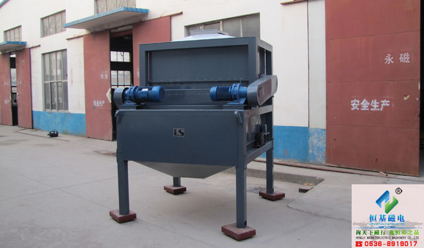 其运行原理是物料经料仓落入匀速给料装置,通过给料装置将物料在没有进入磁选区之前,用振动的方式对物料和磁性物质通过重力和振动,使粘连或包裹的磁性物质基本实现分散状态。并能够均匀的送到磁选区域,在设备的磁选区受到重力和磁场力的作用下,利用物料的磁性差异有不同的运动轨迹实现分离,磁性矿物被吸附在磁辊表面旋转到达精矿区,毛刷将吸附在磁辊表面上的磁性矿刷脱。